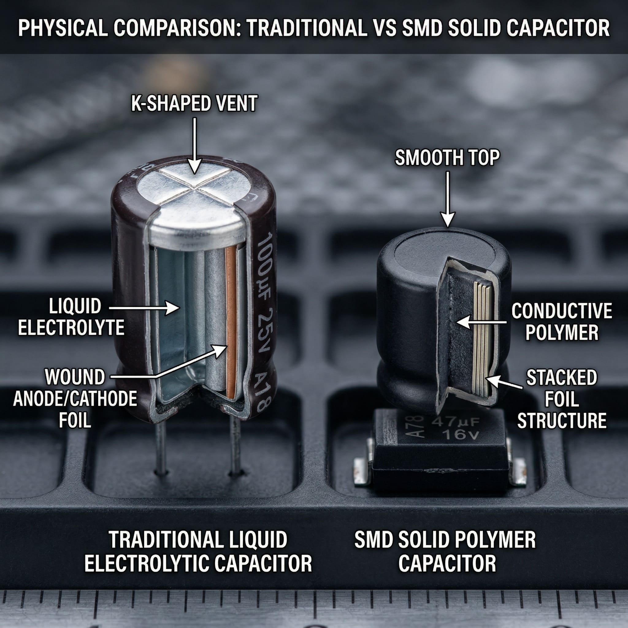 在精密電子設備的設計過程中,硬體工程師經常面臨一項關鍵決策:究竟該選用傳統的液態元件還是先進的高分子元件?這場固態電容 vs 電解電容的技術對比,核心在於電解質材料的物理革命。傳統電解電容使用液態電解液,雖然成本低廉且技術成熟,但其物理結構上常見的「K 字防爆槽」正反映了其潛在風險——在高溫環境下,電解液會逐漸蒸發導致乾涸,進而引發性能衰退。相比之下,固態電解電容採用導電高分子材料,徹底解決了液態流失的問題,成為現代主機板、伺服器與精密工業電源中維持長期穩定運作的首選方案。