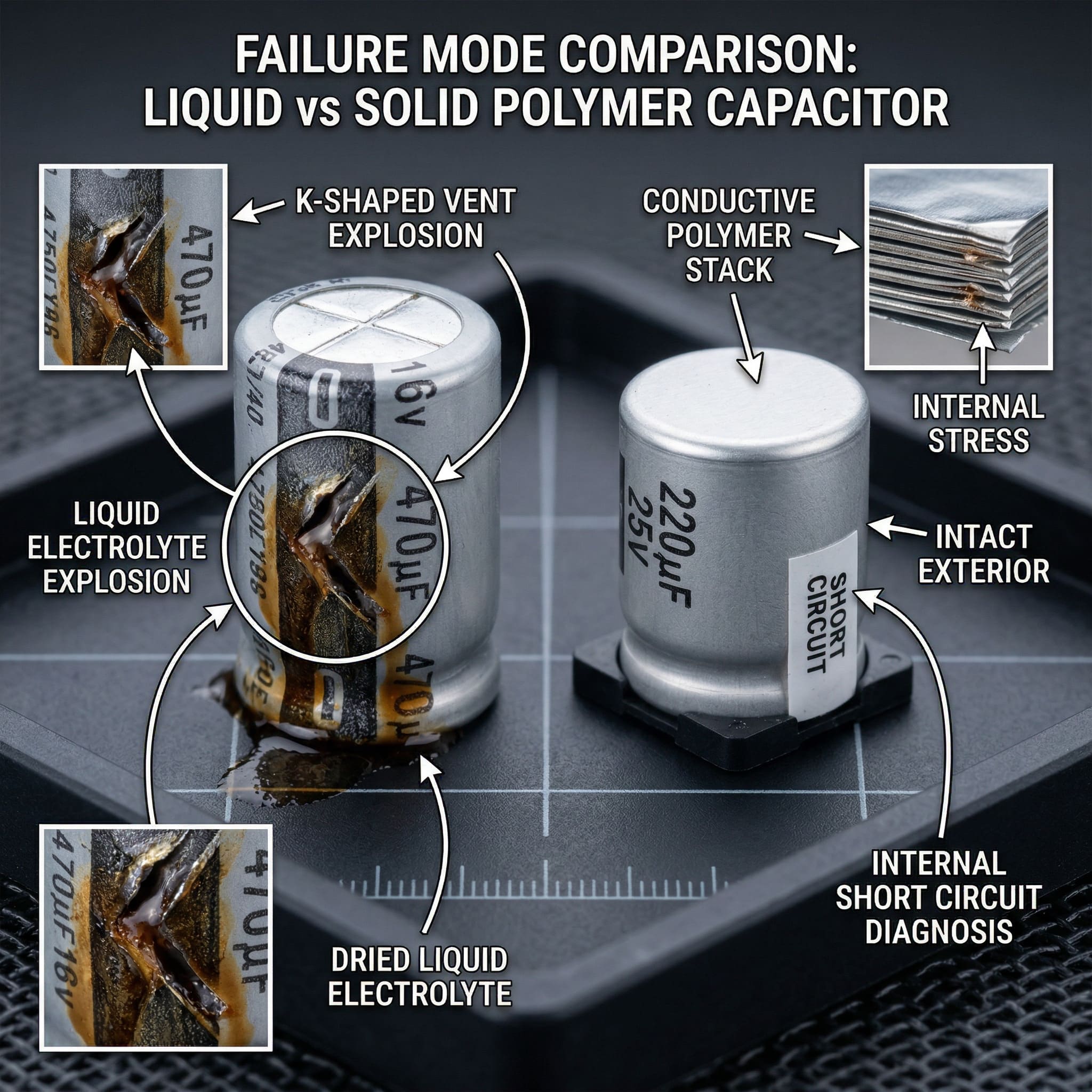 固態鋁質電解電容最顯著的優點之一,在於其卓越的安全機制,能徹底防止令硬體玩家聞之色變的「爆漿」(Bulging/Leaking)事故。在傳統的液態電解電容中,當電路發生異常高溫或浪湧電壓時,內部的液態電解液會迅速氣化,導致鋁殼內壓瞬間劇增,最終撐開頂部的「K 字防爆槽」噴出腐蝕性液體,往往連帶損壞周邊的 PCB 佈線與主動元件。固態鋁質電解電容由於內部無液體可供氣化,其物理性質極其穩定。即使在極端失效條件下,固態電容也大多呈現短路或高阻抗狀態,而不會發生劇烈的物理噴發,極大提升了硬體系統的基礎安全性。